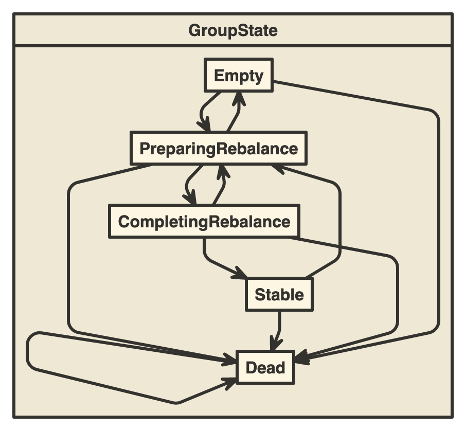 - CompletingRebalance (anciennement AwaitingSync) : le groupe est en attente de l'attribution d'un état de la part du leader du groupe.